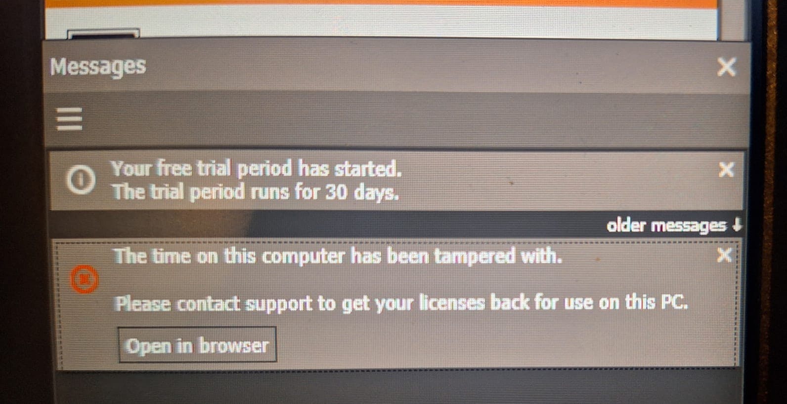 "The time on this computer has been tampered with. Please contact support to get your licenses back for use on this PC. Open in browser."