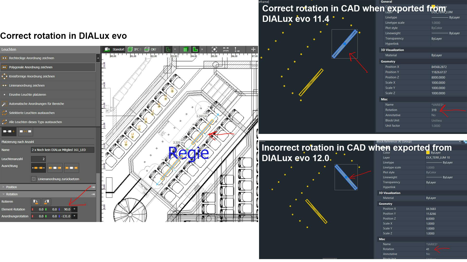 I have noticed that when I export luminaires from quite a complex project (theatre auditorium) to DWG file, some of the luminaires appear to be exported with wrong rotation. I have exported DWG from this same DIALux file with previous version (DIALux Evo 11.4) and the rotation upon DWG export seemed to work fine.