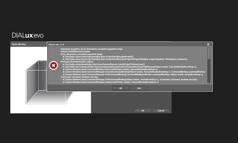 As I Try and open my Dialux project, I get this error. I Tried uninstalling and reinstalling and updating my computer but nothing has helped. I turned off my antivirus, downloaded a patch- cleared all my temporary files. I also removed anyh dialuxx files I had on my computer. Please help! Nothing has worked and I cant find any solution on google! ๐ข