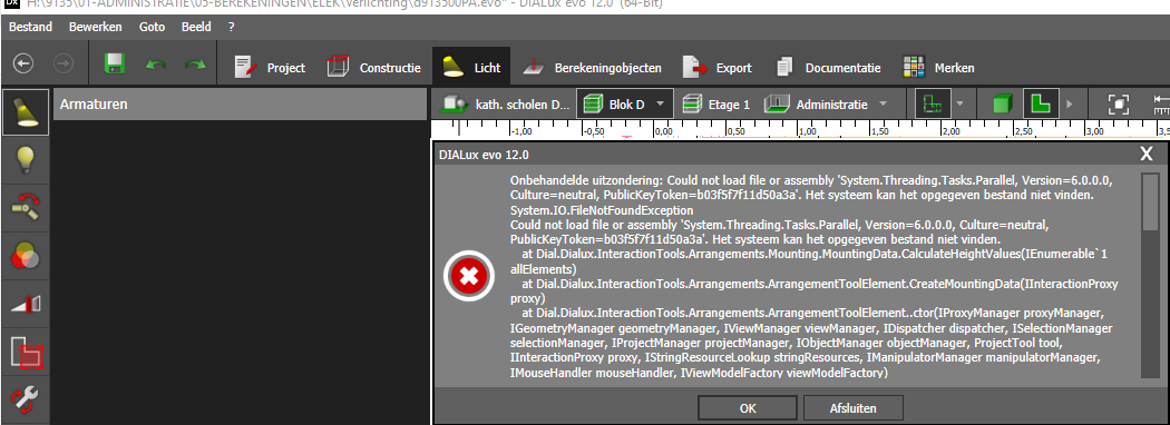 I am having an error each time I click on any fixture in the project. It tells me that it could not load the file or assembly. I only used the luminaire finder to bring these into my project. What could have gone wrong here? All the fixtures are from the same producer.