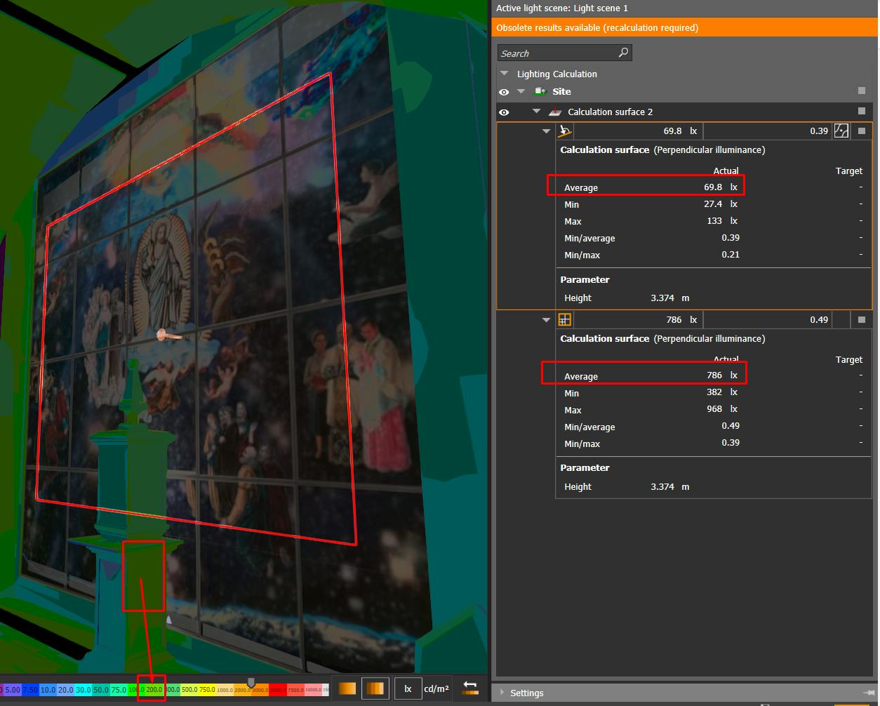Also, if you see false colours, it doesnt seems realistic that average is 69Lx when false colours in objects are over 200Lx...