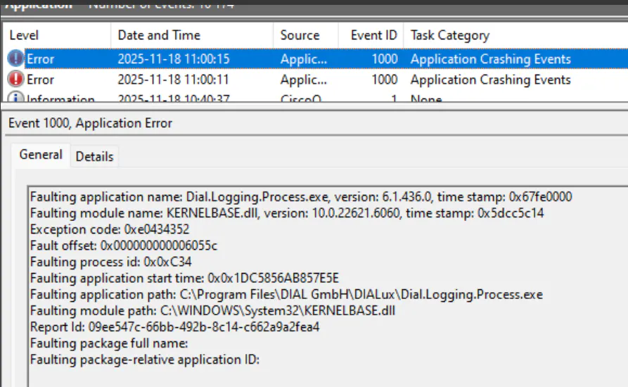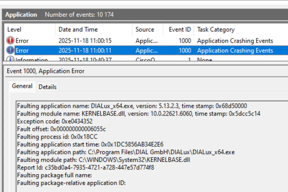 There's no error message from Dialux at all. The program just closes down. Really difficult for us to say what causes the problem.