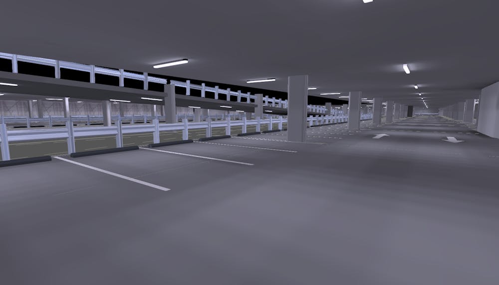 Lighting design for a large multi-storey car park with 2 separate glazed staircases including external lighting using IP65 linear LED luminaires / column mounted luminaires on roof top + some bollards lighting pathways.