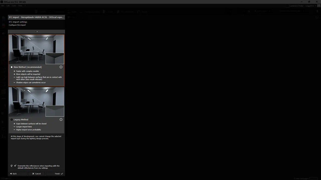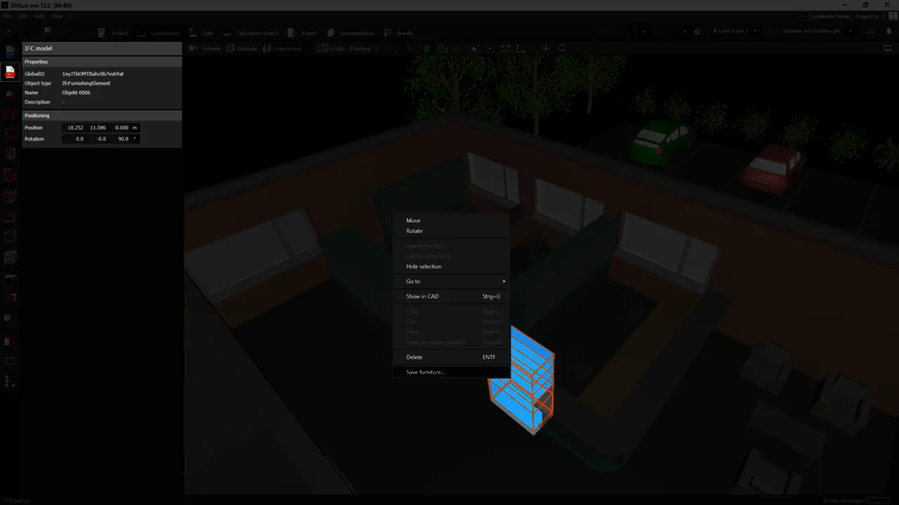 With DIALux evo 14, development continues to move forward. The focus is on better support for IFC models that already contain luminaires. During import, these are automatically replaced by placeholder luminaires, which can later be easily swapped with products from your own luminaire list.
