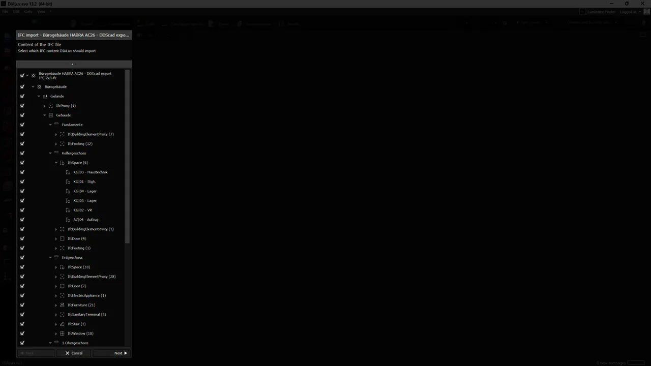The focus of development was to enable a faster and more stable import of complex IFC models and to optimize the overall BIM workflow. The new import assistant displays the contents of the IFC model in a clear hierarchy, allowing designers to decide which building elements to import before starting their project.