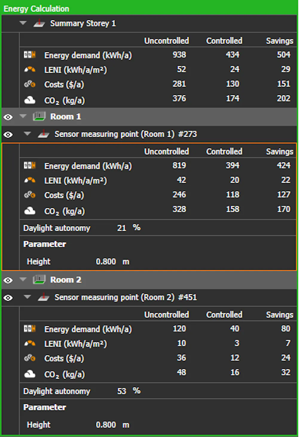 For every hour and every day of the year, the daylight coming in through the windows is determined and the amount of artificial light that needs to be added to achieve the required illuminance is calculated. The result then shows you how much energy, CO2 and money you will save per year if you schedule a regulation.